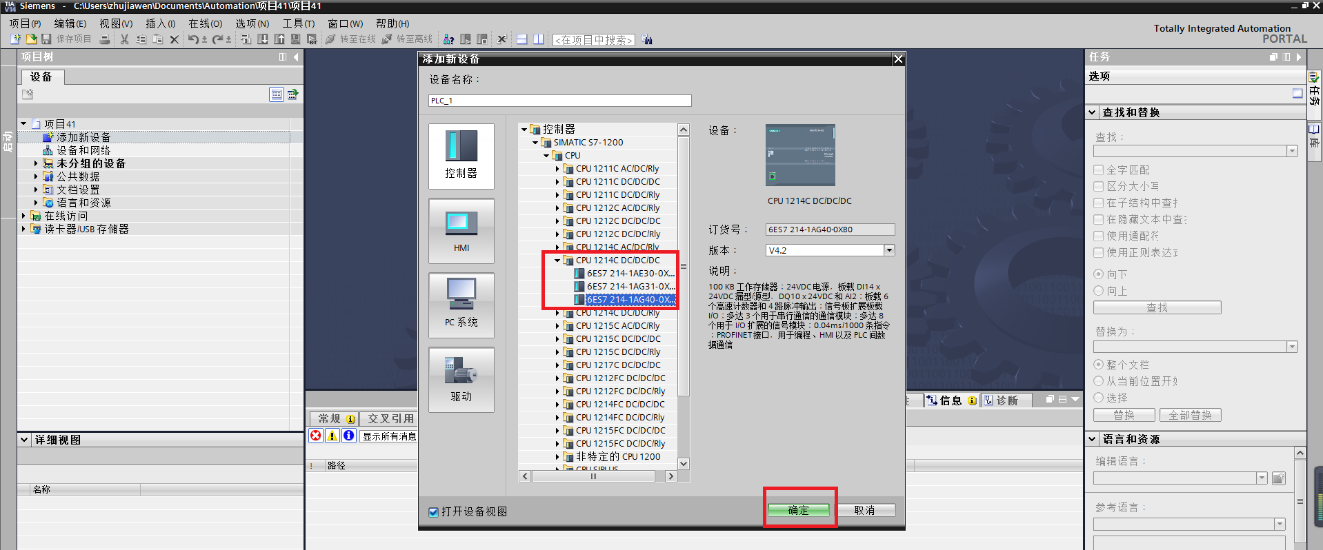 ①以S7-1200為例,先點擊添加新設備,然后在SIMATIC S7-1200里添加一個1214C CPU,然后,點確定。