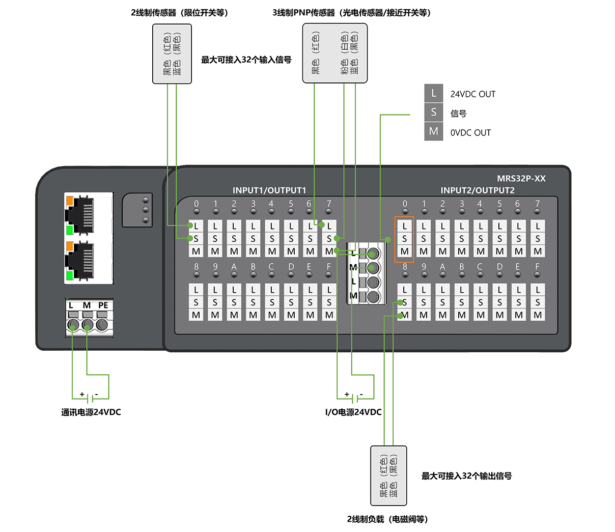 面板式快接線分布式I/O,PROFINET通訊,2xRJ45,可級聯;PNP,32xDI/DO自適應,24VDC,單通道最大輸出0.5A,歐式彈簧端子;導軌安裝&打孔安裝(下單時需備注)
