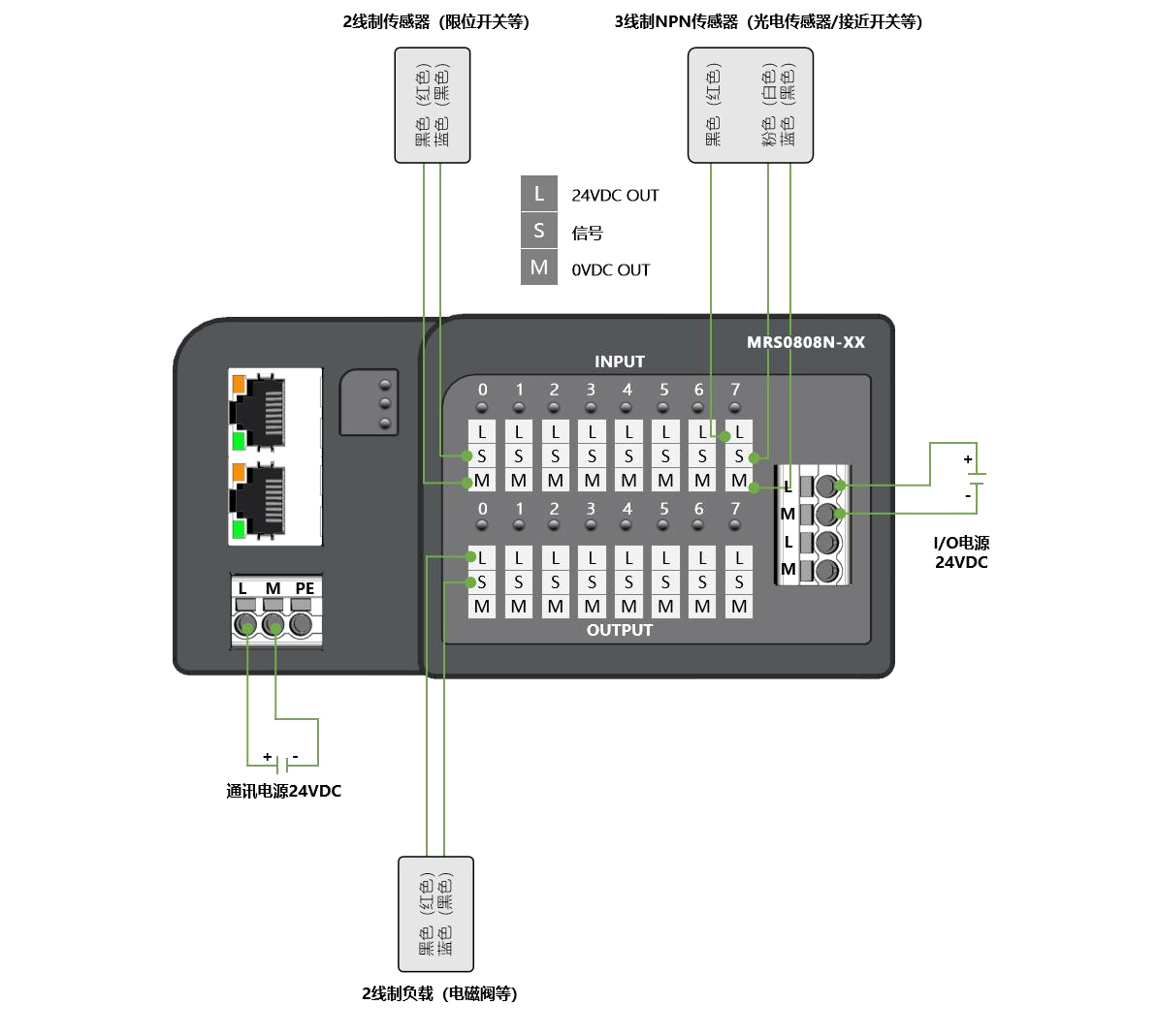 電源接口:模塊供電:3P歐式彈簧端子;負載供電:4P歐式彈簧端子